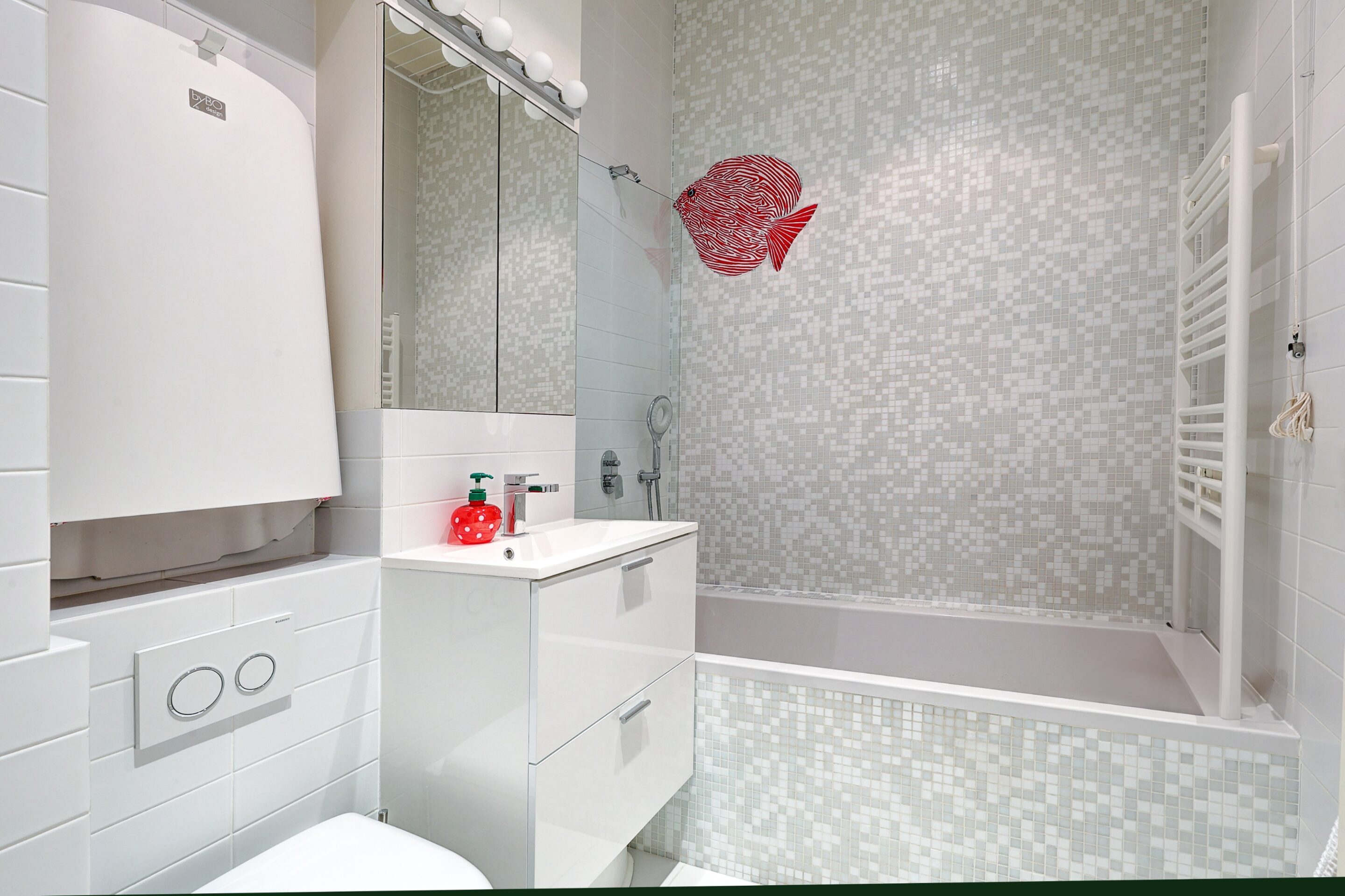 A children’s bathroom with a large bathtub